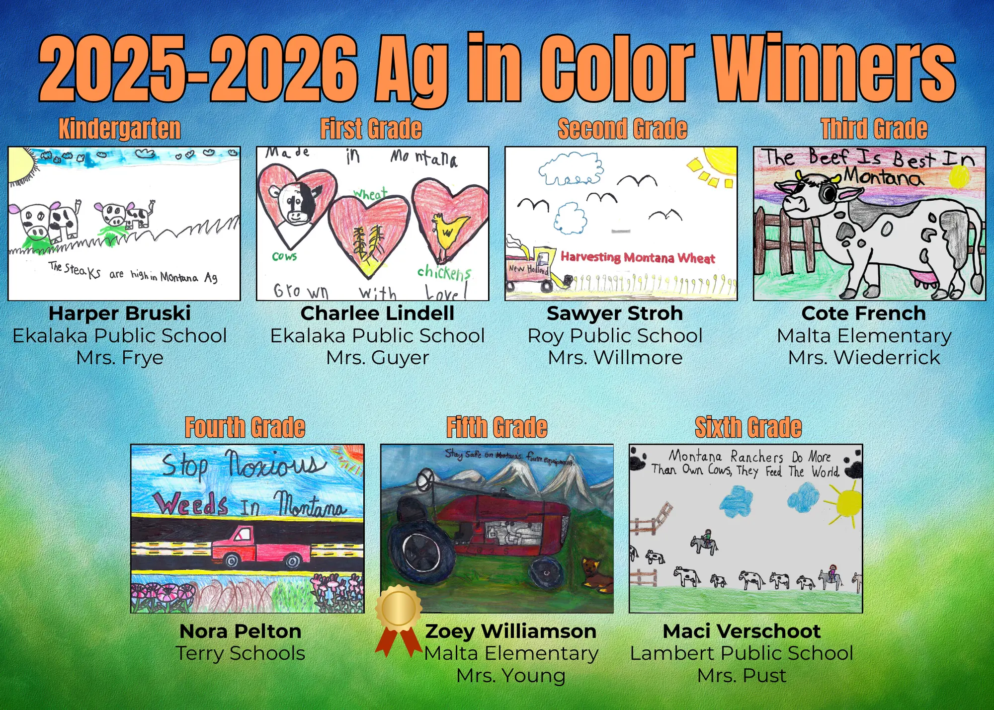The ‘Ag in Color’ drawing contest is open to all students and educators across Montana. Categories are designated for grades K-6. Teachers and parents are encouraged to visit our Teacher Resources page for lesson plans and information about each category. Entries must be submitted to the County Farm Bureau by December 4, 2026. The County Farm Bureau will submit the local winners to the Montana Farm Bureau for statewide consideration by December 18, 2026. Drawings are judged by the Montana Farm Bureau Women’s Leadership Committee and other volunteers on agricultural content, originality, neatness, and reproducibility. Winning entries will be printed and distributed on usable items and other educational materials.